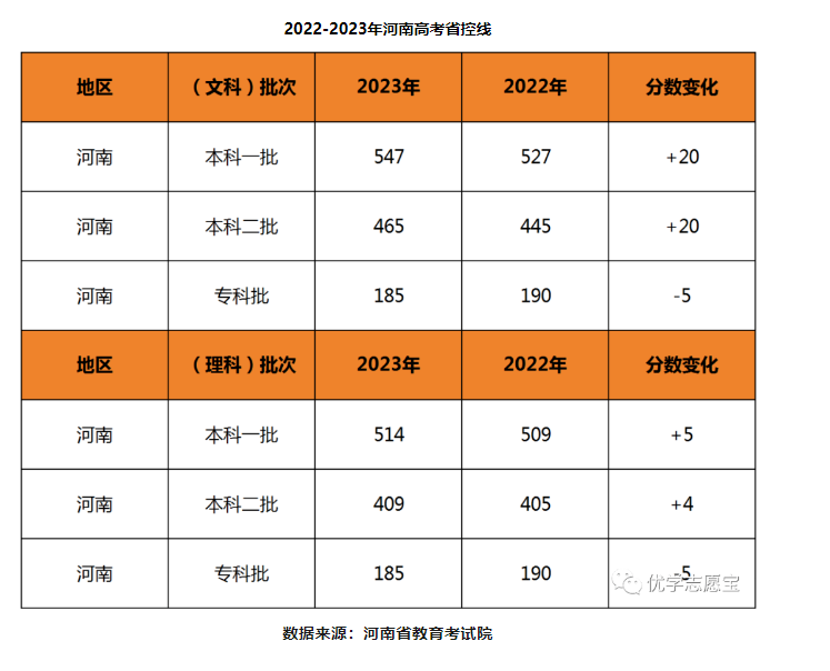 2023年河南普通本科批文理科各分为本科一批、本科二批、专科批。针对2022、2023年各批次的省控线进行汇总和变化的分析、从下表可知,2023年河南省文科本科一批省控线为547分,相较于2022年上涨了20分;本科二批省控线为465分,上涨了20分;专科批次下降了5分。2023年理科本科一批的省控线为514分,相较于2022年上涨了5分;本科二批上涨4分;专科批次省控线下降了5分。