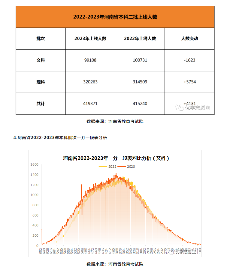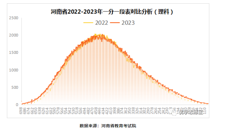 上图是河南省文科本科批次一分一段表的对比分析图,从图表中我们可以看出总体趋势上2022年与2023年总体曲线走势基本一致,2023年652及以上超高分数段人数远远多于2022年。2023年高分段和低分段的人数分布没有太大差异,511分左右差距是最大的,从图上可以看到一个很明显的突起。400分左右的区间分布人数最多,同时也意味着该分段的考生面临的择校竞争会更加激烈。在图表中我们不难发现,在中高分段,2023年的人数分布是略高于2022年的。