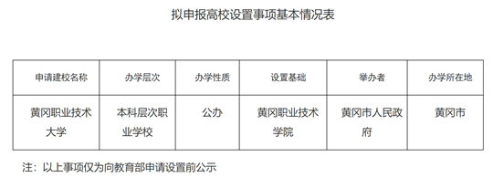 根据《中华人民共和国高等教育法》《中华人民共和国职业教育法》《本科层次职业学校设置标准(试行)》《教育部关于“十四五”时期高等学校设置工作的意见》等有关规定,经评议,现对拟向教育部申报“以黄冈职业技术学院为基础设立黄冈职业技术大学”事项予以公示。