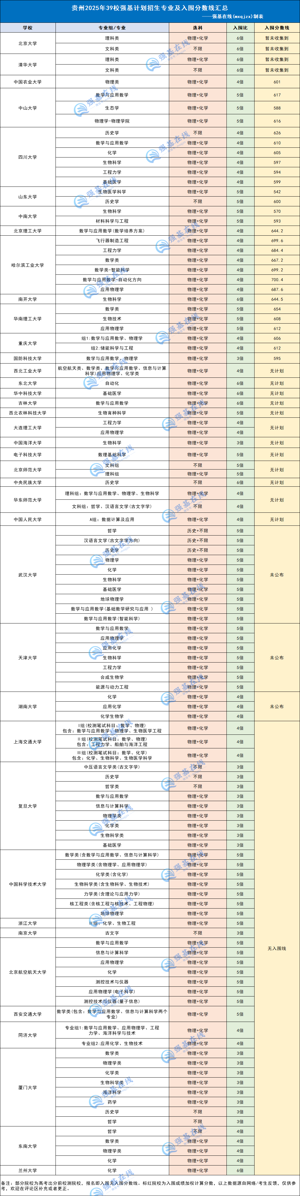 ③湖南大学、天津大学、武汉大学未公布强基入围分数线,西工大、东大、华科大、吉大、西北农林、大连理工、中国海洋、电子科大、北师大、中央民大、华东师大、人大12校在贵州地区没有招生计划。
