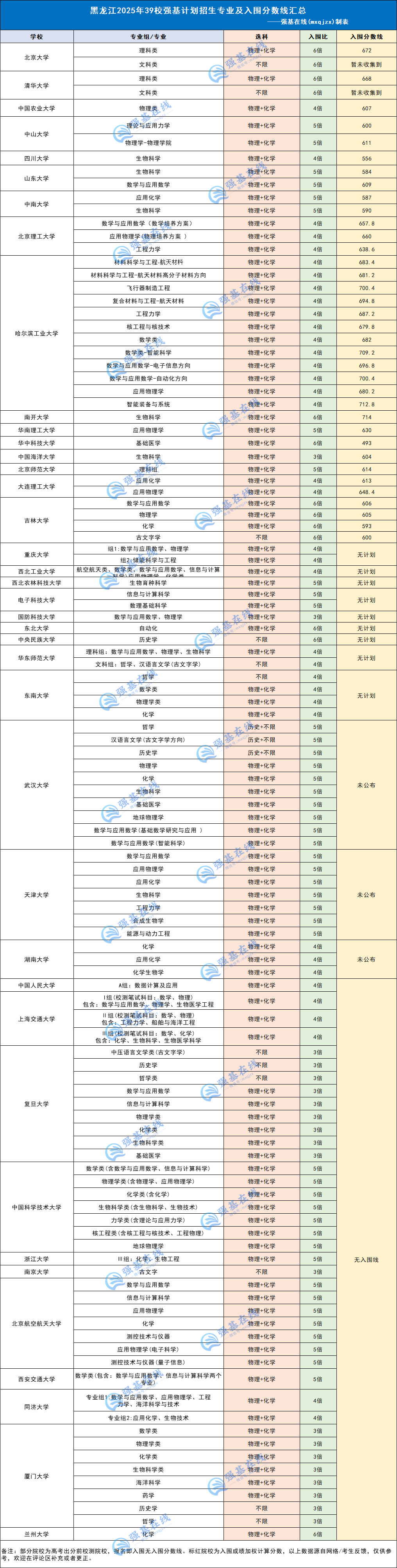③湖南大学、天津大学、武汉大学未公布强基入围分数线,重大、西工大、西北农林、电子科大、国防科大、东大、中央民大、华东师大、东南大学9校在黑龙江地区没有招生计划。
