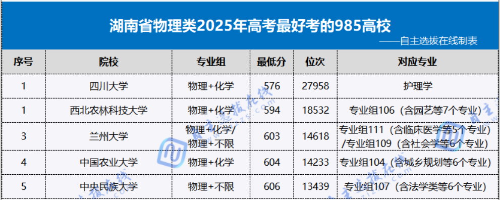 湖南省物理类考生最好考的5所985高校分别为四川大学、西北农林科技大学、兰州大学、中国农业大学、中央民族大学。观察2025年各高校在湖南的录取情况,位次28000左右的考生都有机会考上985高校!