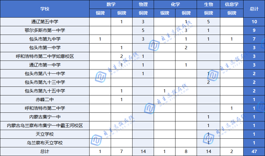本次统计中,内蒙古各中学在五大学科竞赛中共获得47枚奖牌(主要为铜牌,含少量银牌),覆盖数学、物理、化学、生物、信息学五个学科,反映了内蒙古在基础学科竞赛领域的整体参与水平与成果分布。