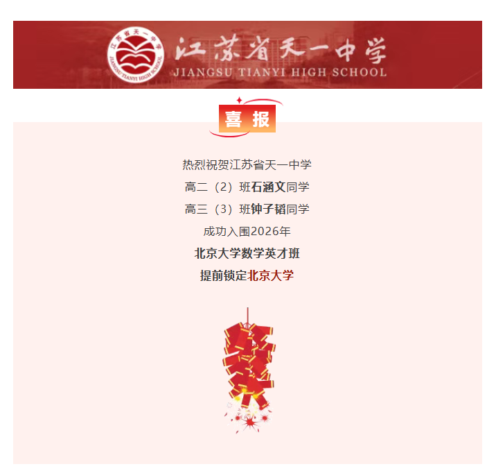 天一中学2人入选2026年北京大学数学英才班