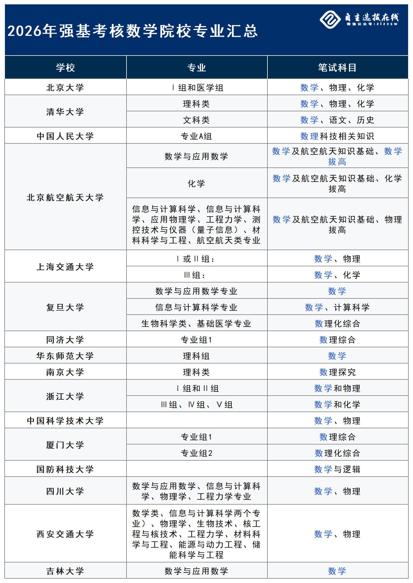 以下是2026年强基招生简章中明确说明要考核数学的院校和专业汇总: