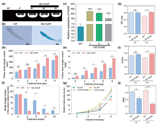 为验证该系统的应用价值,研究团队聚焦于氮代谢关键基因——硝酸还原酶基因PyNR,成功获得PyNR稳定过表达的转基因株系OE-PyNR,显著增强了紫菜叶状体的氮吸收与同化能力,提升了紫菜在低氮胁迫下的生长和光合适应性,为培育耐低氮紫菜新品种提供了关键靶基因,并充分验证了该遗传转化体系在性状改良与基因功能解析中的实用价值。