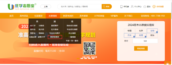 用户登录系统后,在菜单栏点击志愿填报模块,在'测'的栏目下,点击测录取概率,即可进行院校录取概率测试。