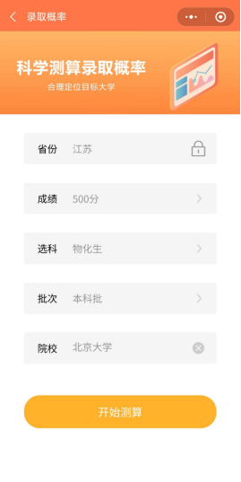 进入后,我们需要输入分数,选择我们的选科(文理科省份选择文史/理工),选择填报的批次,输入指定的院校名称,点击下方测录取概率即可进行测试,下方以北京大学举例