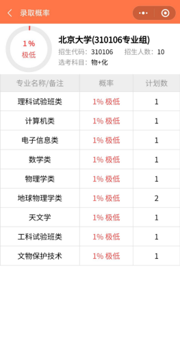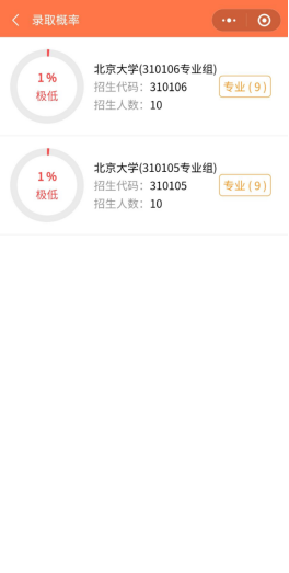 点击测录取概率后,即可显示对应的数据信息,点击查看专业按钮,可以查看该专业组下专业的详细信息。