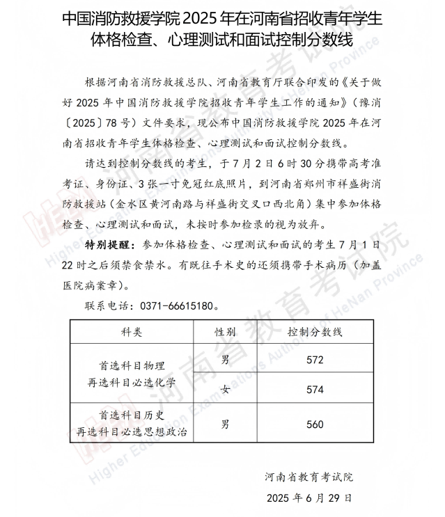 中国消防救援学院2025年在河南省招收青年学生体格检查、心理测试和面试控制分数线