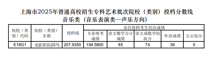专科艺术批次院校(类别)投档分数线[音乐类(音乐表演类—声乐方向)]