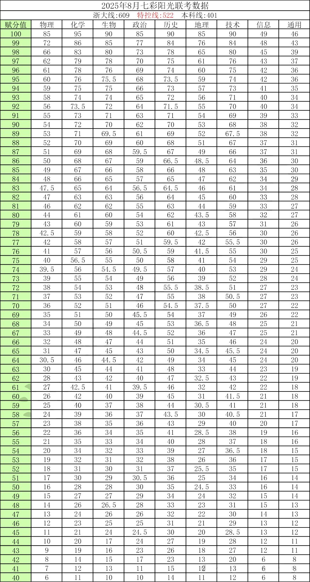 2025年七彩阳光联盟高三返校联考赋分表出炉