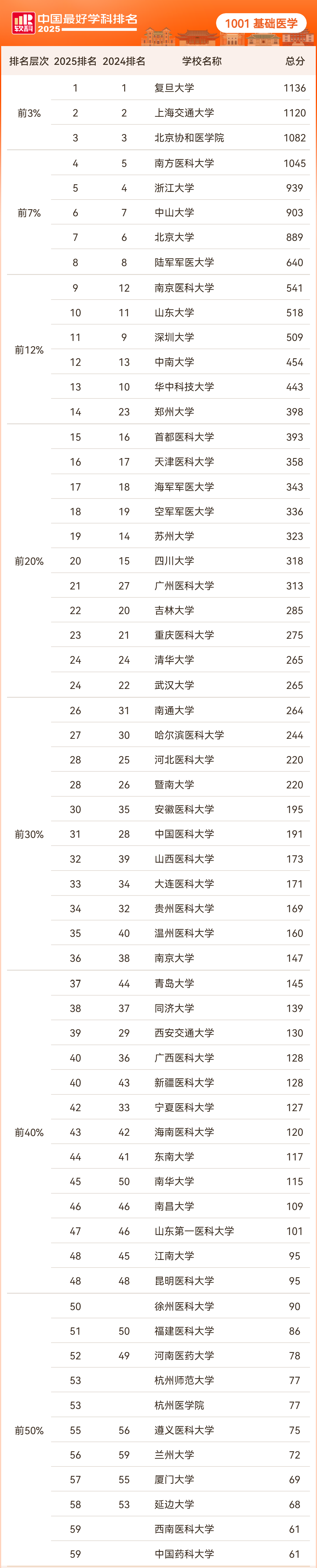 复旦大学以1136分蝉联榜首,上海交通大学(1120分)和北京协和医学院(1082分)紧随其后,分别位列第二、三位。前五名高校中,南方医科大学从第五名升至第四名,浙江大学从第四名降至第五名,显示出头部高校竞争格局基本稳定,但内部位次出现微调。