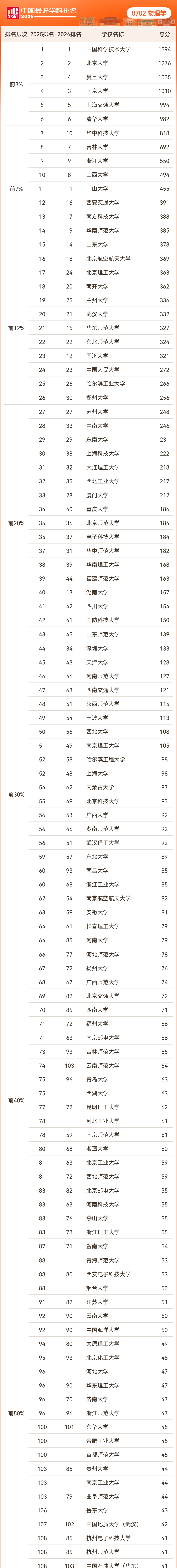 顶尖梯队保持领先:中国科学技术大学以1594分蝉联榜首,优势明显。北京大学和复旦大学紧随其后,与南京大学、上海交通大学、清华大学共同构成前3%的第一梯队,体现了传统物理强校的深厚积淀。