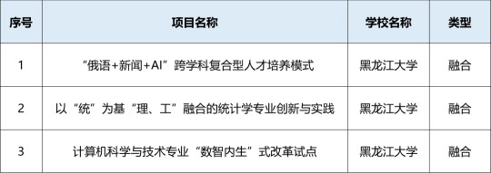 近日,黑龙江省教育厅发布《关于开展高等教育综合改革首批试点的通知》,公布全省高等教育综合改革首批试点立项名单。黑龙江大学凭借深厚的办学积淀、鲜明的学科专业特色和扎实的改革实践,成功获批11项省级试点项目,全面覆盖本科专业结构优化与动态调整试点、区域产教融合优势特色专业集群建设试点、地方高校'101计划'增补试点、人才培养改革实验区建设试点四大类别,立项数量位居全省高校第三、省属高校第一,具体立项情况如下。 本科专业改造升级试点(3项)