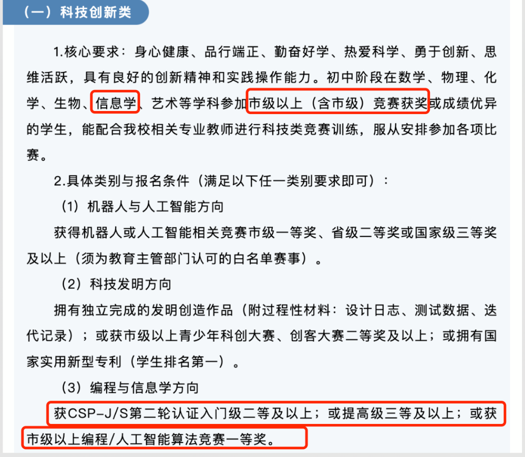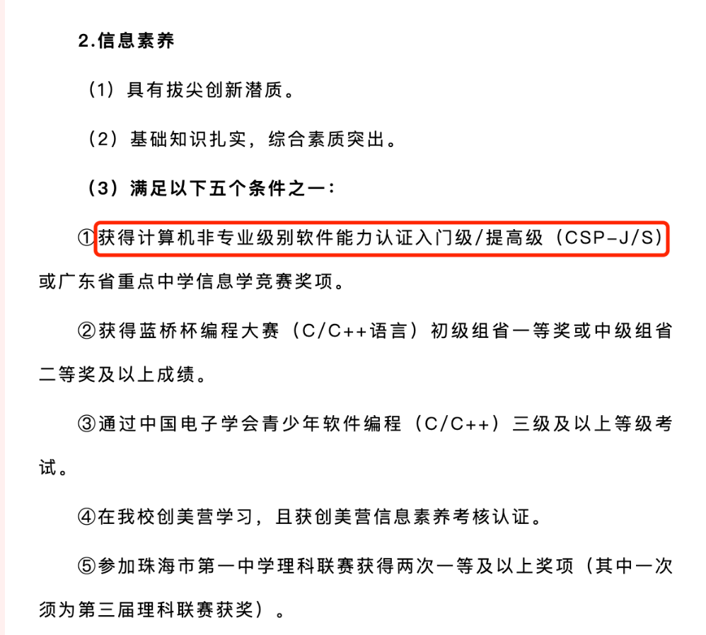 部分学校的简章中,除了在报名条件中提到初中毕业生需提供的奖项证明,如珠海市第一中学的条件之一有'获得计算机非专业级别软件能力认证入门级/提高级(CSP-J/S)或广东省重点中学信息学竞赛奖项'。