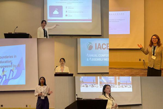广州城市理工学院五位教师受邀做主题汇报(叶海燕 提供) 本次会议中,多场平行论坛聚焦商科教育的创新实践。广州城市理工学院5位参会教师受邀进行每人40分钟的汇报分享。其中,在Canyon B会场里,王晓晶作为首位汇报者,以'面向未来的审计师'为主题,分享数字孪生与智慧教室融合的审计教育创新成果。王一旭围绕《将竞赛融入教学:将跨文化能力培养融入外语教学》,结合全球语言教育聚焦复杂情境下跨文化交际能力培养的需求,分享如何将跨文化能力大赛融入相关课程。叶海燕以《连接课堂与实践:通过混合式教学法提升HRM 教育中的体验式学习》为题,结合学校人力资源管理专业的课程特色,搭建了混合体验式模型。在Alpine East会场内,邹楚发表《超越计量经济学教育的边界:人工智能赋能的PBL模型》主题演讲,她提出AI赋能的项目式学习(PBL)计量经济学教学模式。在Alpine West会场内,钟晓韵以《人工智能技术在国际贸易教育中的融合实践研究》为题发表演讲。她提出,人工智能可从智能教学资源、教学模式创新、考核评价改革三个维度赋能国际贸易教育。