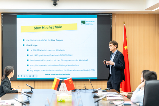 Prof. Dr. Ingo Schünemann对学校的热情接待表示感谢,并详细介绍了柏林bbw应用技术大学的办学实力、学科专业、质量保障体系,双元制教学特色及国际合作成果。他表示,bbw应用技术大学作为德国优质应用技术大学,拥有完善的实践教学体系与丰富的企业合作资源。同时他进一步强调,愿与学校携手推进课程共建、师资交流、人才联合培养等工作,共同培育具有国际视野与实践能力的高素质应用型人才。